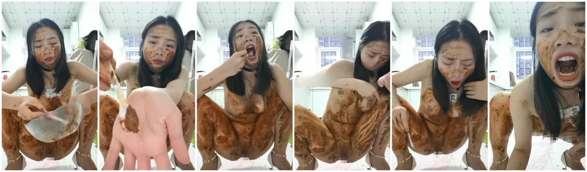 全裸把身份证贴在身上,然后把自己拉的屎抹遍全身和脸,用勺子把身上的屎刮下来吃,表情很狰狞,还干呕,这屎吃起来不是那么享受了,清纯的模样和满身的排泄物和下体的阴环形成强烈的反差。