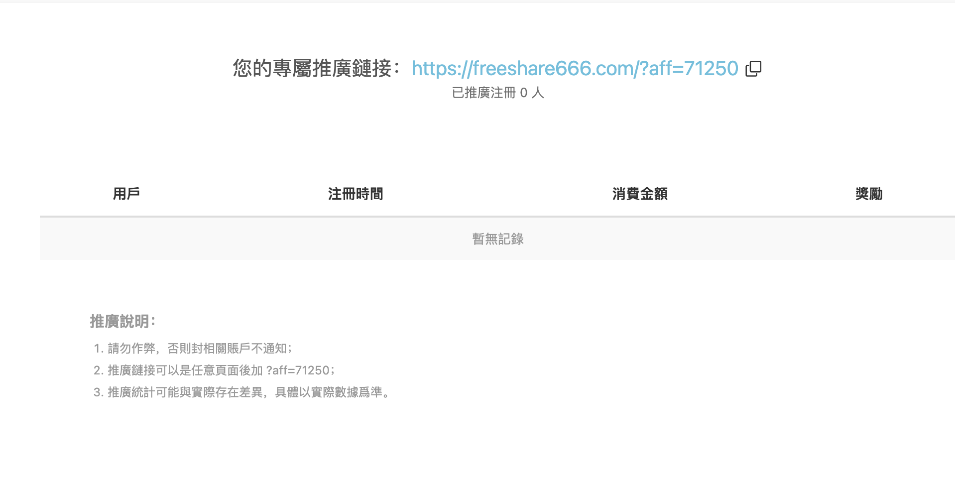 1.登陆网站,建议从发布页freeshare666.vip选择第一个入口登录网站,点开个人中心,点击我的推广,可以看到下图